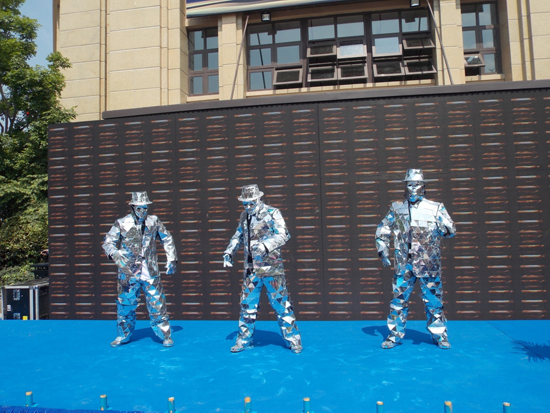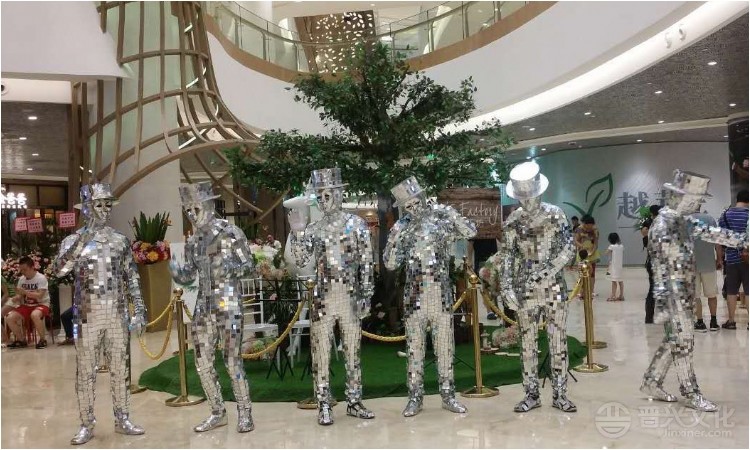 镜面人表演,由艺人穿上全身会放光的小镜片做的演出服,酷炫夺目,光芒四射,可以做人体雕塑静态展示,也可以配合炫酷的舞台灯光做舞蹈表演,演员既能给参观者高雅的艺术享受,又能给商业活动造成一大宣传亮点。